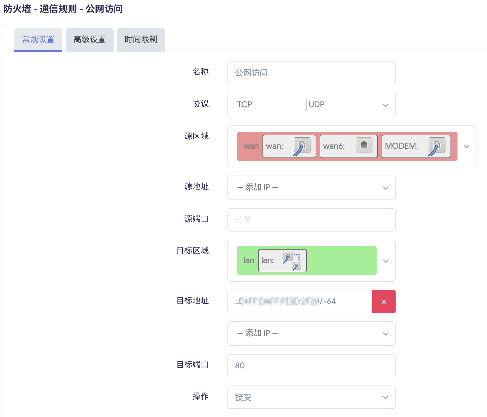 在 网络 - 防火墙 - 通信规则 里添加一条规则,目标地址填 ::IPv6后缀/-64 ,源区域: WAN ,端口填 v2ray 配置的端口,参考我的: